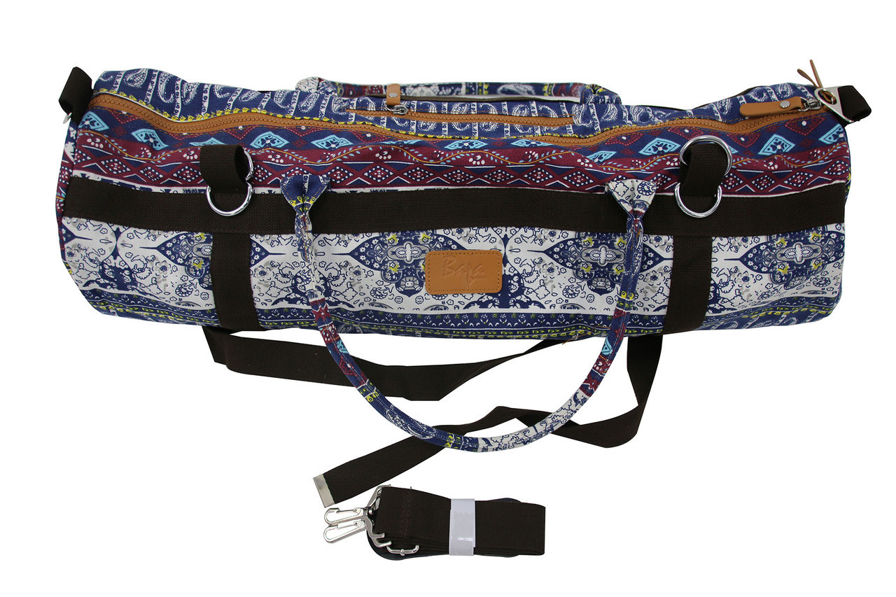 The Baja Stretch Yoga Mat Tote Bag is made from durable 100% Patterned Canvas. The Bag is lightweight, super soft and washable. Comes with padded carry handles, shoulder carry strap, side pouches and Easy Access Zipper.